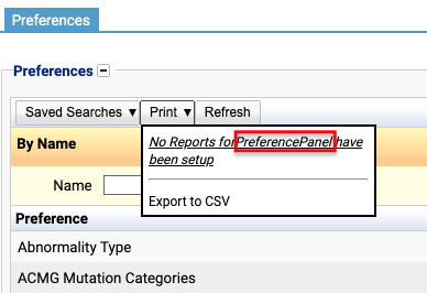 In the image below, The print box shown on the Preferences table describes reports for ‘PreferencePanel’ and this is the model that would be selected from the dropdown for the model field.