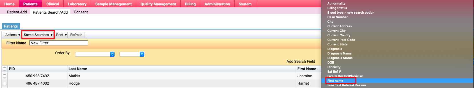 This example will create a filter that appears on the Patient List page and enables a search for a patient’s first name.